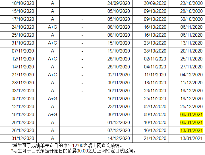 2020年用于英国签证及移民的雅思考试口试预定开始日期、 考试报名截止日期、准考证打印日期和成绩单寄送日期