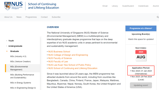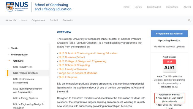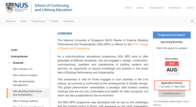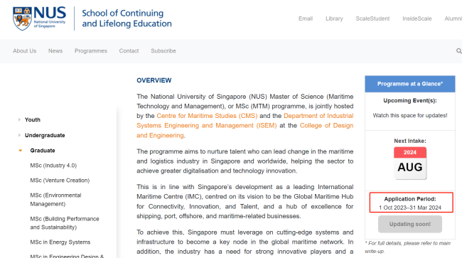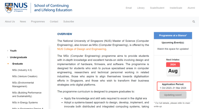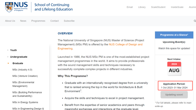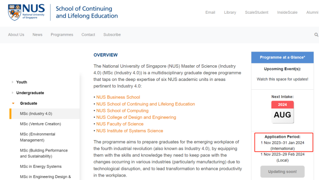 新加坡国立大学--持续与终身教育学院申请开放时间相比23Fall申请季开放时间晚了一个月,去年是10月1日开放,今年是11月1日开放。