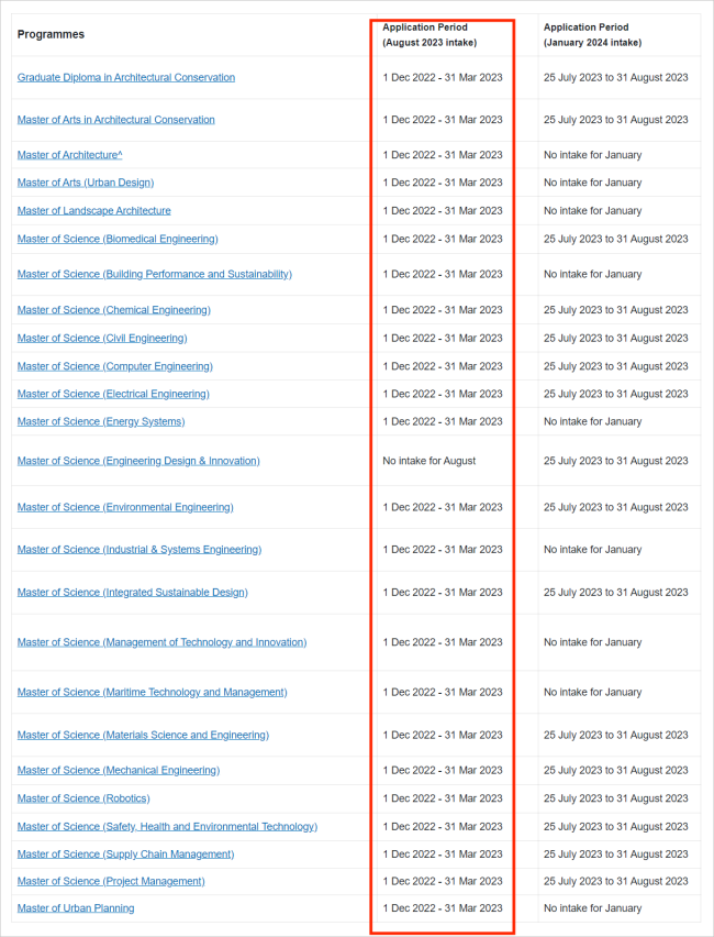 要知道,新加坡国立大学--设计与工程学院的专业基本都是全部一起开启申请的,从学院还未更新的表格就可以看出,23Fall申请季新国立--设计与工程学院所有专业是在2022年12月1日开放申请。